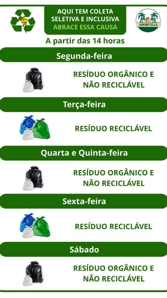Por isso, pedimos atenção especial para que o descarte dos rejeitos e recicláveis seja realizado em local adequado e dentro do cronograma da coleta seletiva inclusiva.