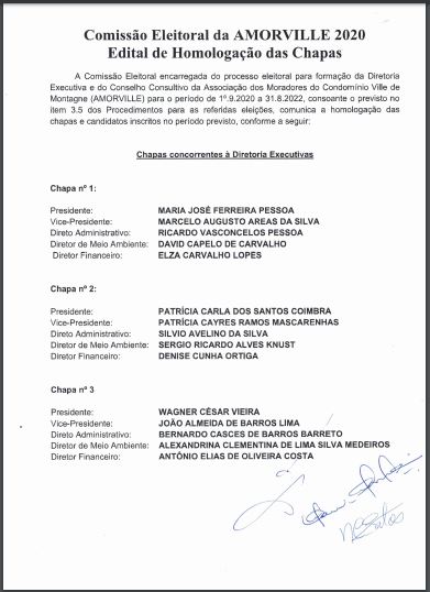 Comissão Eleitoral da AMORVILLE 2020 - Edital de Homologação das Chapas