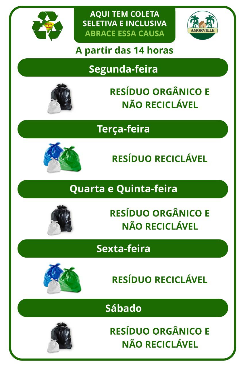 A partir de 16 de novembro a coleta seletiva no Ville de Montagne será realizada pela Associação de catadores Recicla Mais Brasil. O recolhimento do lixo começa um pouco mais tarde, às 14h00, mas os dias para cada tipo de coleta permanecem os mesmos.