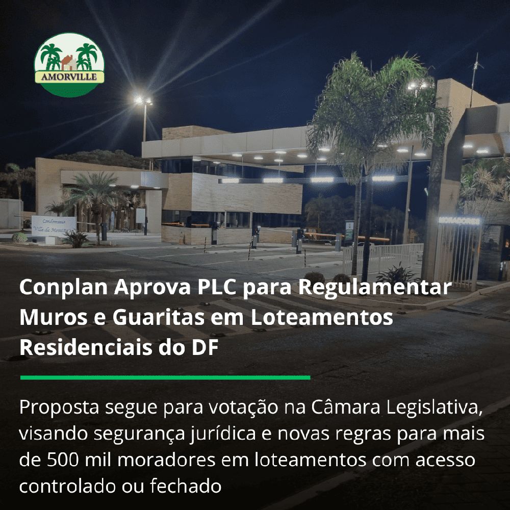 O Projeto de Lei Complementar (PLC) que regulamenta muros e guaritas em loteamentos residenciais do Distrito Federal, foi encaminhado ao Conselho de Planejamento Territorial e Urbano do Distrito Federal (Conplan) e, após ser discutido, foi aprovado (31/10) e será encaminhado à Câmara Legislativa do DF (CLDF) para aprovação final e para sanção do Governador. Este PLC busca formalizar as condições para muros e guaritas, oferecendo alternativas como "loteamentos de acesso controlado", onde o acesso público é permitido, e "loteamentos fechados", que permitem restringir o acesso mediante concessão onerosa.