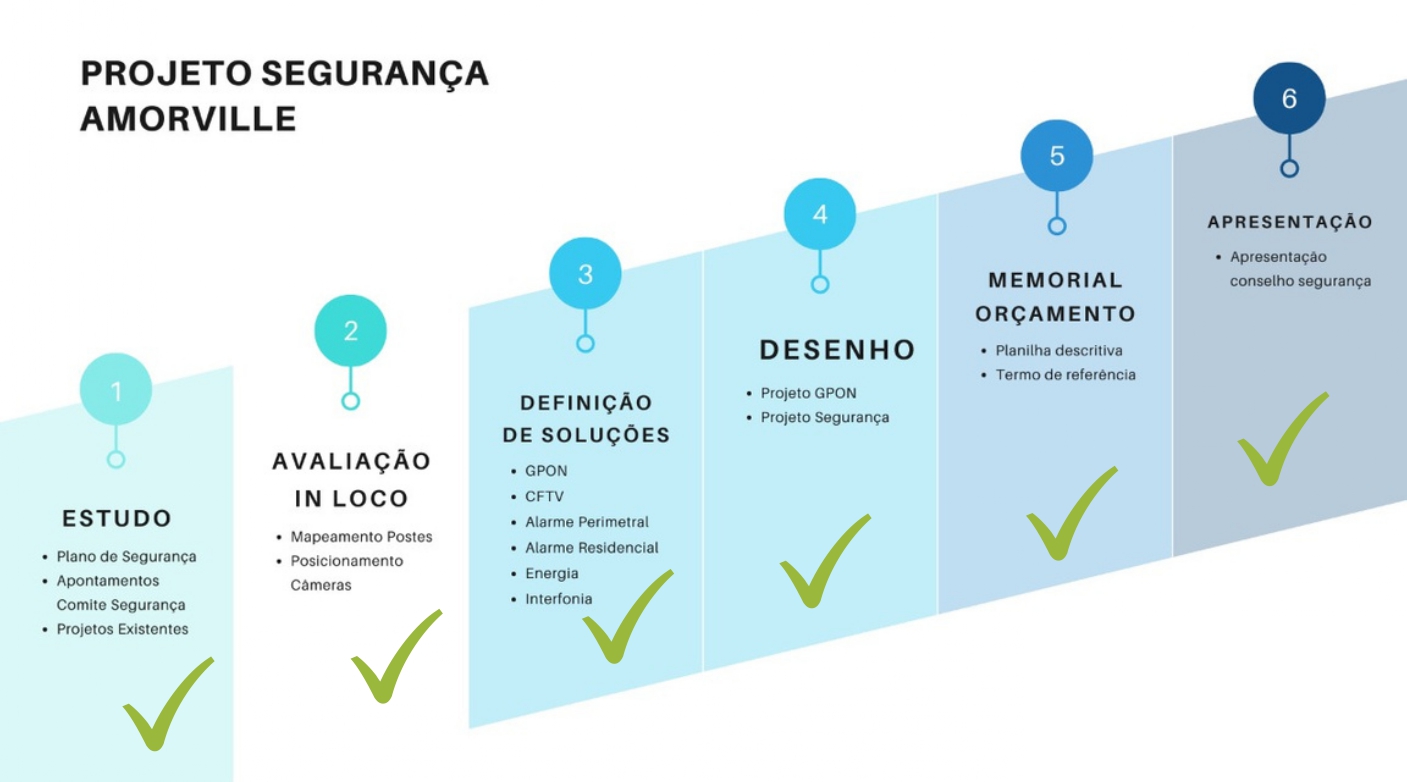 Os próximos passos são a conclusão da elaboração do Projeto Executivo e o processo de seleção para a contratação da empresa que ficará responsável pela execução do Plano de Segurança, o que significa a implantação de todo o sistema (com deliberação em Assembléia). Essa implantação será acompanhada pela Nasa Tecnologia, em conjunto com a Comissão de Segurança e a Diretoria Executiva do Ville.