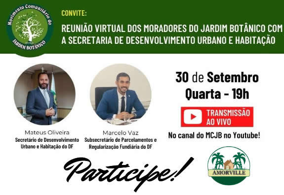 O Movimento Comunitário do Jardim Botânico (MCJB) realizará uma reunião virtual com a Secretaria de Desenvolvimento e Habitação (Seduh) para atender as demandas por informações sobre: regularização, normatização do fechamento dos condomínios, o processo de revisão do PDOT, o andamento dos processos de regularização e licenciamento, Alvarás, etc.