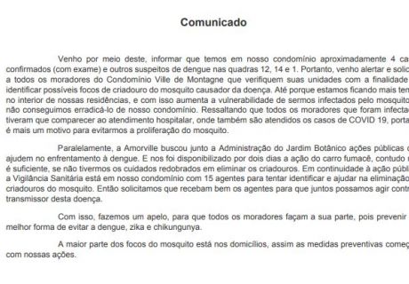 Venho por meio deste, informar que temos em nosso condomínio aproximadamente 4 casos confirmados (com exame)...